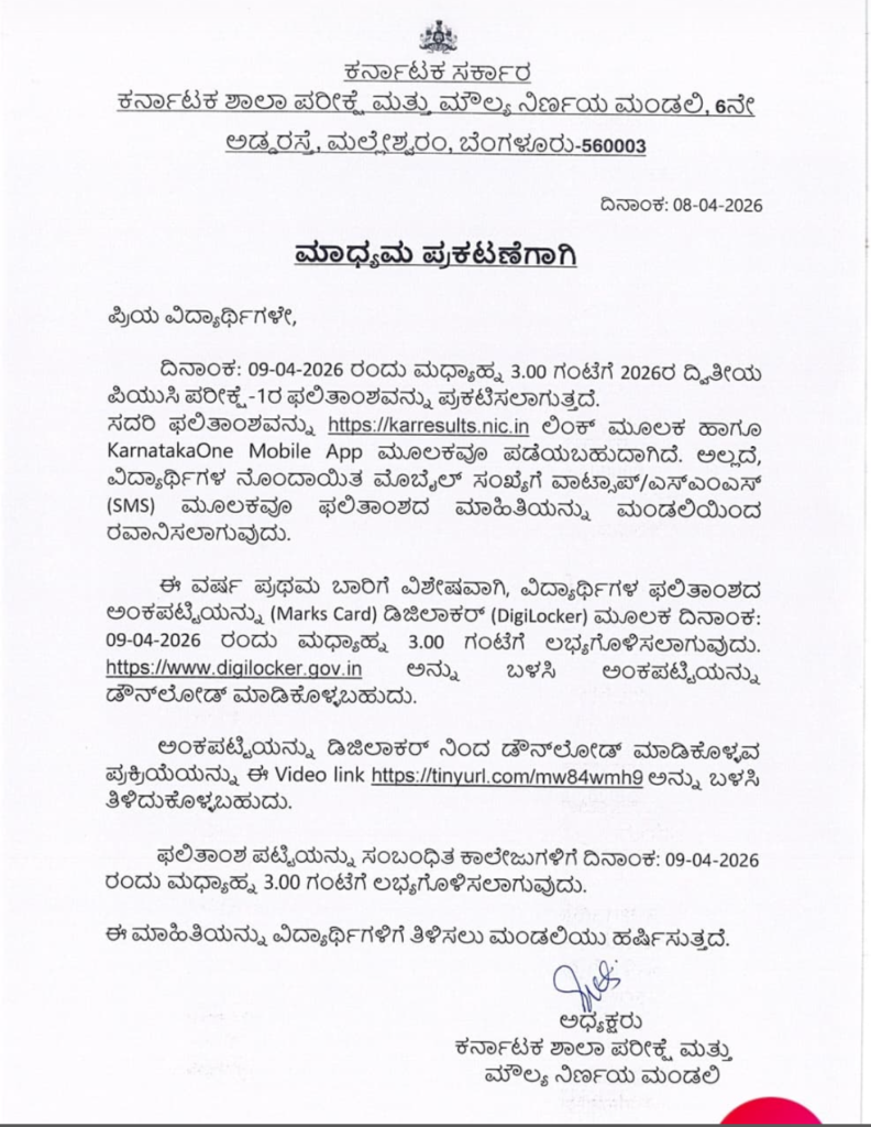 - ನಾಳೆ (09-04-2026) ಮಧ್ಯಾಹ್ನ 3.00 ಗಂಟೆಯಿಂದಲೇ https://www.digilocker.gov.in ವೆಬ್ಸೈಟ್ ಅಥವಾ App ಬಳಸಿ ನಿಮ್ಮ ಅಧಿಕೃತ ಅಂಕಪಟ್ಟಿಯನ್ನು ಡೌನ್ಲೋಡ್ ಮಾಡಿಕೊಳ್ಳಬಹುದು.